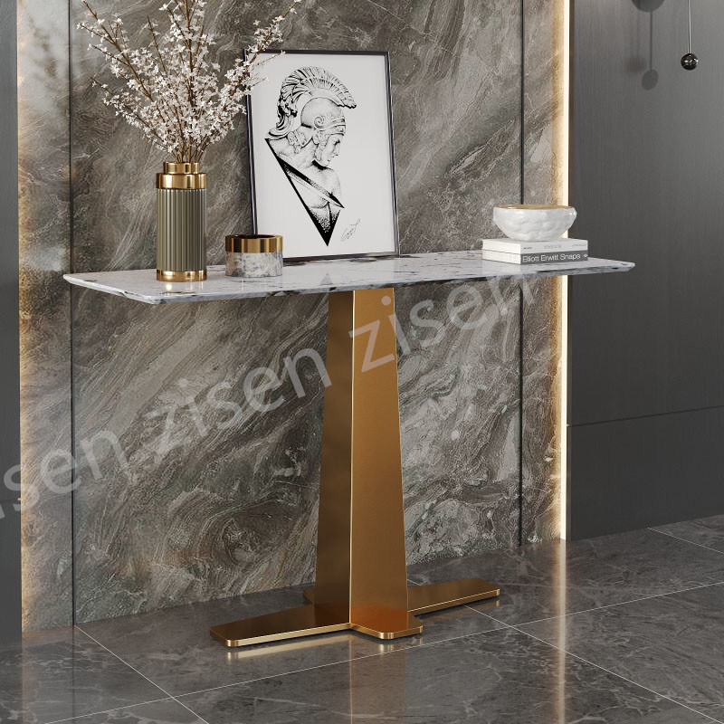 1.Керамическая мраморная столешница: Консольный стол имеет высококачественную керамическую мраморную столешницу, которая добавляет прикосновение роскоши и изысканности.демонстрируя естественную венозность и цветовые вариации, которые делают каждую часть уникальнойПрочность керамики гарантирует, что столешница выдержит повседневное использование, сохраняя при этом свою красоту.