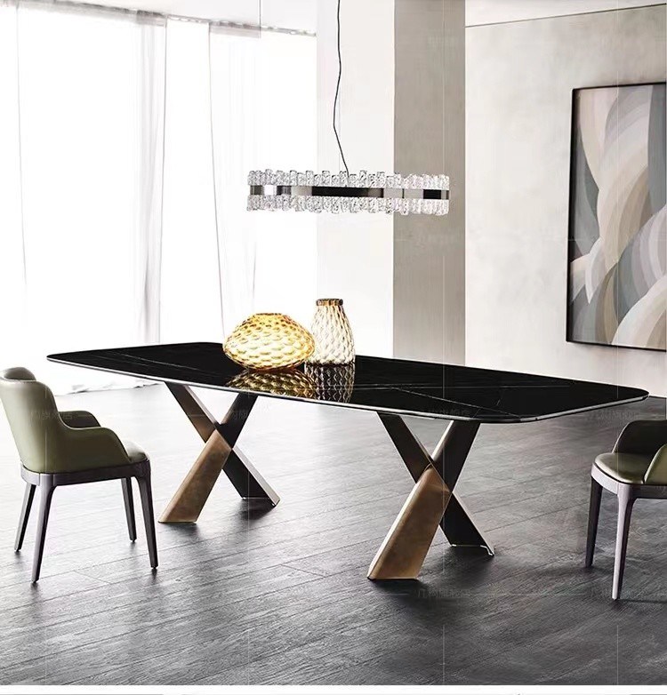 | Наименование продукта | Современный роскошный сцинтерованный камень Золотая основа с керамической столовой Мебель столовой |